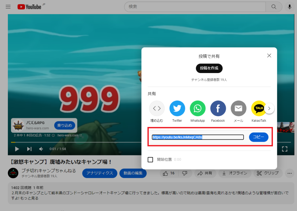 まずは埋め込みたいYoutube動画の埋め込みコードを取得します。
