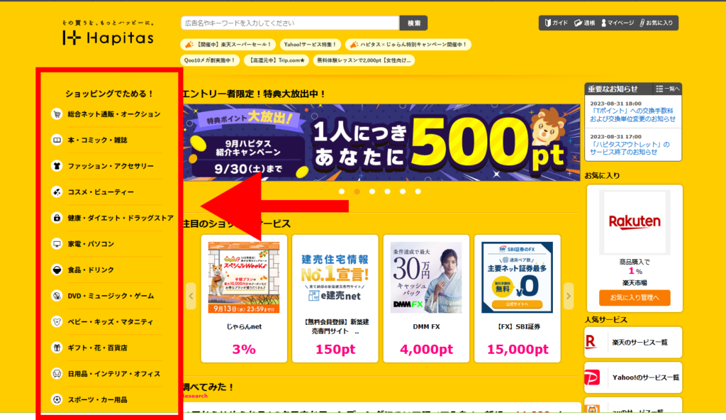 ハピタスサイトのサイドメニューにカテゴリの選択欄があります。