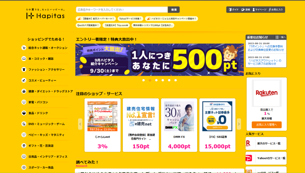 楽天ショップや楽天トラベルなどもハピタスと提携しています。