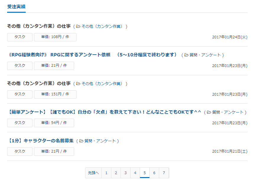 下記の画像のように受注実績として残るので、数円のアンケートといえど、丁寧にこなして良い評価を貰いましょう。