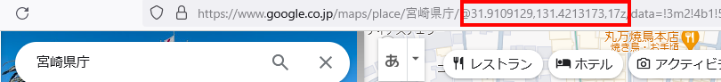 ちなみに緯度と経度はGoogleMapで検索した際にURLに表示されるので、そこから取得するのが簡単です。