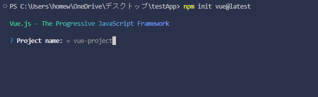 npm init vue@latest初回はcreate-vueパッケージをインストールするかどうかを聞かれるので「y」を入力して次へ。