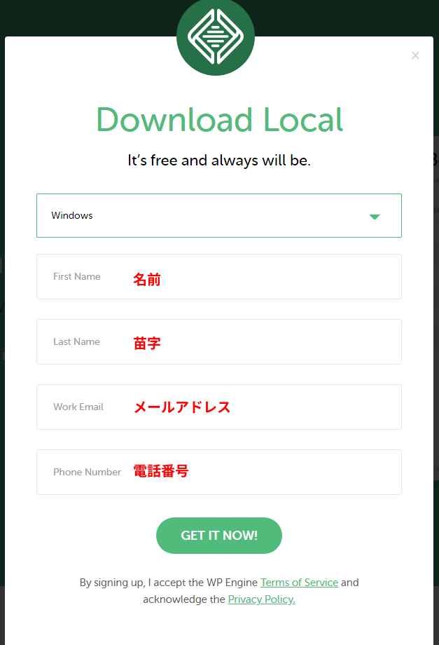 プラットフォームを選択すると、上から名前、苗字、メールアドレス、電話番号の入力画面が表示されます。